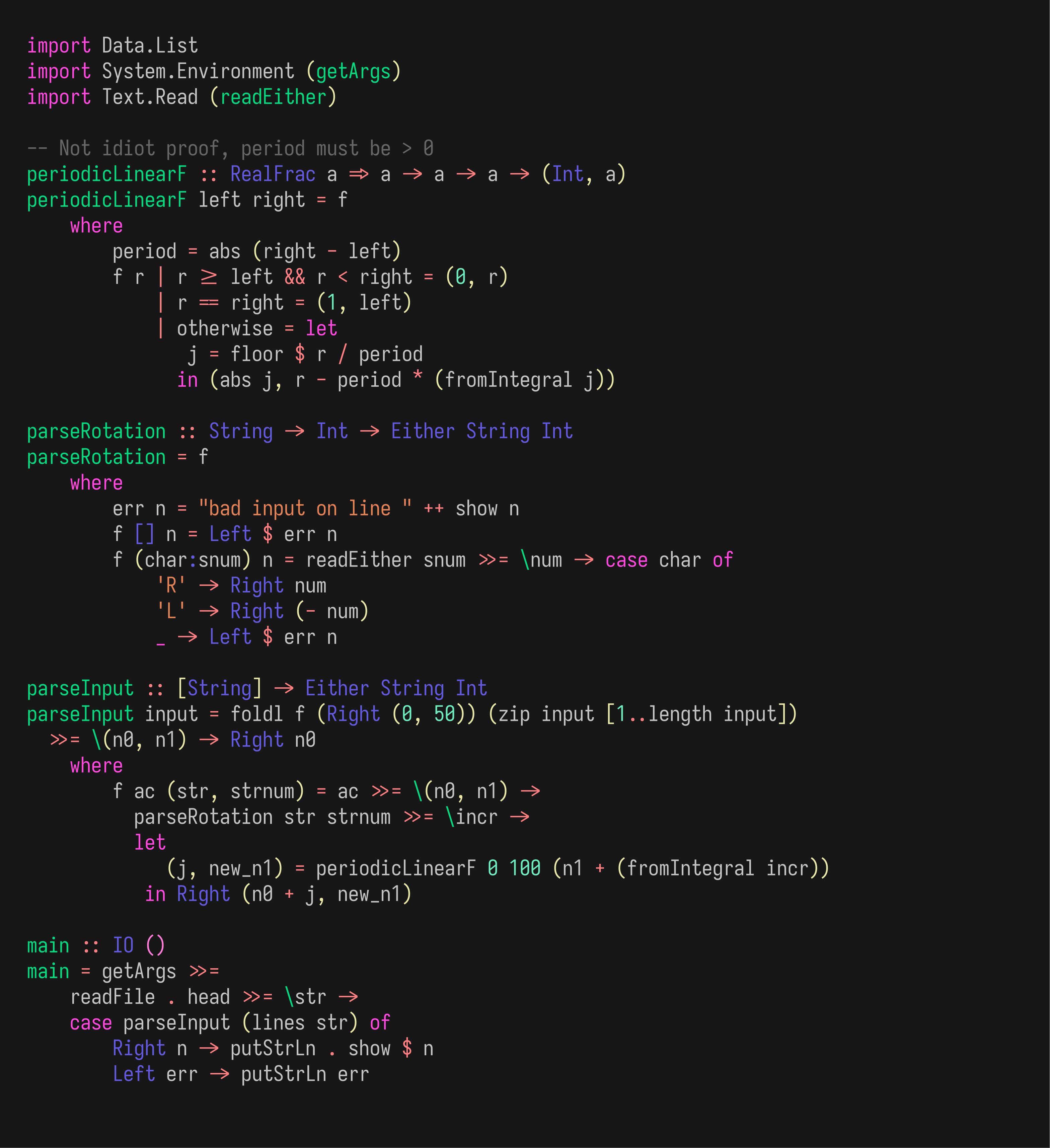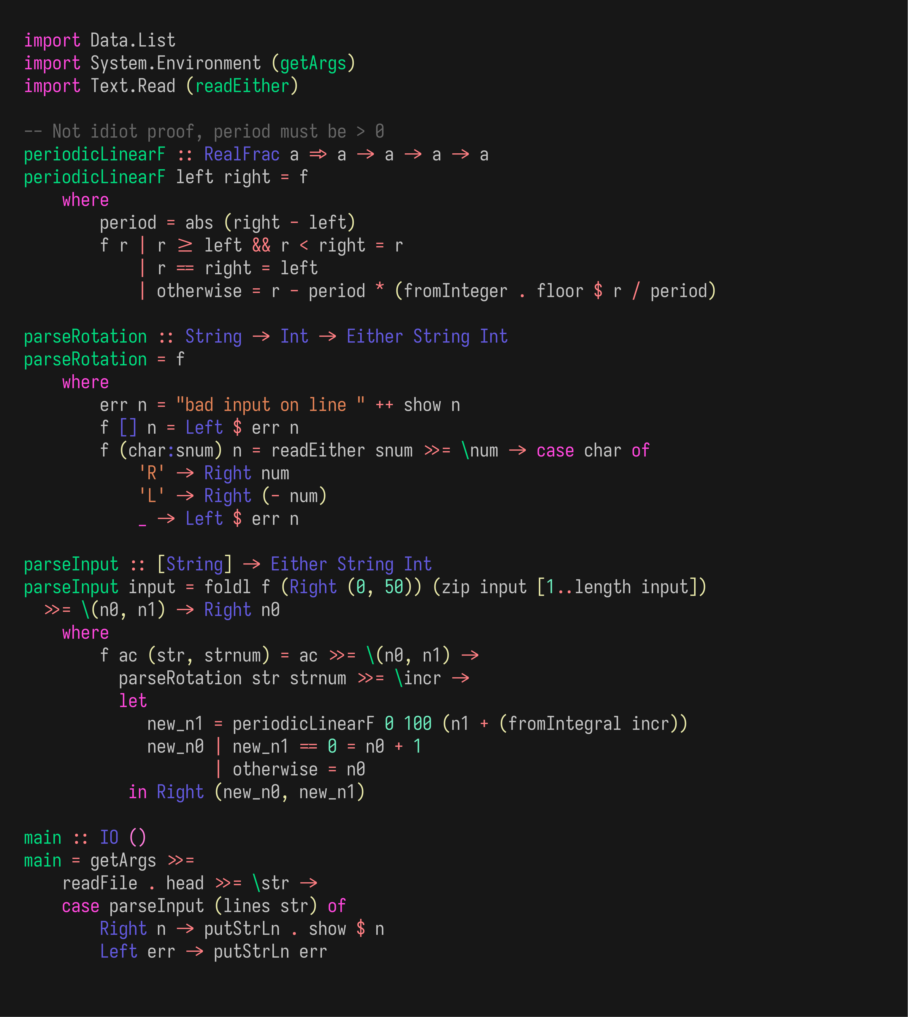 >>26197 base64 -w 0 < aocd1p1.hs | exiftool -comment'<=/dev/stdin' -overwrite_original aocd1p1.png >>26198 У них какие-то проблемы. Вторая часть пазла, нужно считать не только количество раз, которое число принимает нулевое значение, а и количество раз, которое оно через него переходит.