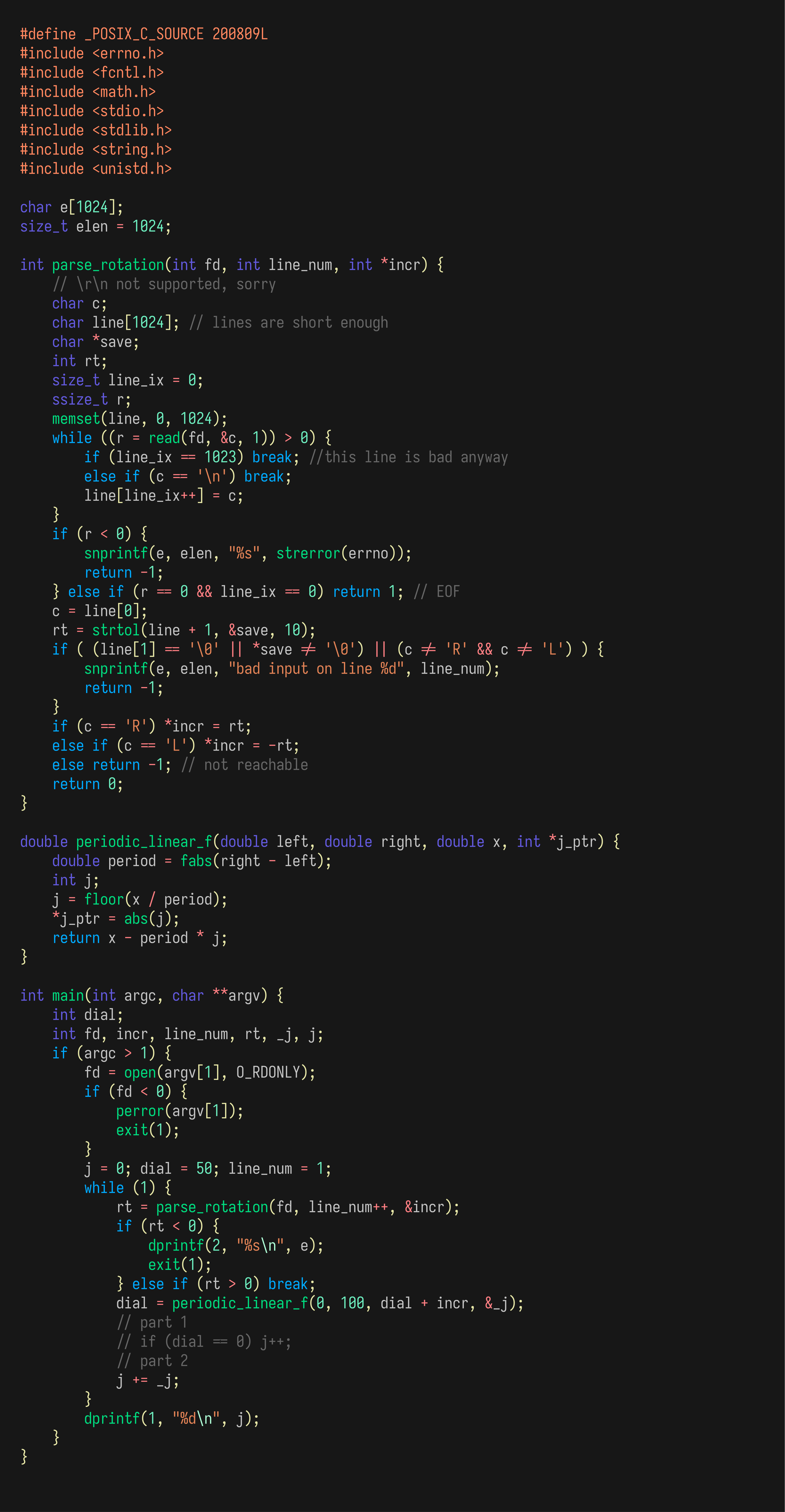 >>26197 Anyway, какая вторая часть пазла? Меня через github не пускает, говорит "This account is flagged, and therefore cannot authorize a third party application." %Это ведь из-за анимеаватарки, да? I2luY2x1ZGUgPHN0ZGxpYi5oPgojaW5jbHVkZSA8c3RkaW8uaD4KI2RlZmluZSBERUJVRwppbnQgbWFpbihpbnQgYXJnYywgY2hhciAqKmFyZ3YpCnsKCWlmICgxICE9IGFyZ2MpCgl7CgkJc2lnbmVkIGludCBzdGFydCA9IDUwOwoJCXNpZ25lZCBpbnQgbnVtYmVyID0gc3RhcnQ7CgoJCXVuc2lnbmVkIGNoYXIgcGFzcyA9IDA7CgkJY2hhciBzdHJbM107CgkJc3RyWzJdID0gJ1wwJzsKCgkJZm9yICh1bnNpZ25lZCBjaGFyIGk9MDsgaSA8IGFyZ2M7IGkrKykKCQl7CgkJCWZvciAodW5zaWduZWQgY2hhciBjPTA7IGMgPCAyOyBjKyspCgkJCQlzdHJbY10gPSBhcmd2W2ldW2MrMV07CgoJCQlpZiAoJ0wnID09IGFyZ3ZbaV1bMF0pCgkJCQludW1iZXIgPSBudW1iZXIgLSBhdG9pKHN0cik7CgkJCWVsc2UKCQkJCW51bWJlciA9IG51bWJlciArIGF0b2koc3RyKTsKCgkJCWlmIChudW1iZXIgPCAwKQoJCQkJbnVtYmVyID0gMTAwLShudW1iZXIqLTEpOwoJCQllbHNlIGlmICgxMDAgPT0gbnVtYmVyKQoJCQkJbnVtYmVyID0gMDsKCQkJZWxzZSBpZiAoMTAwIDwgbnVtYmVyKQoJCQkJbnVtYmVyID0gbnVtYmVyIC0gMTAwOwoKCQkJaWYgKDAgPT0gbnVtYmVyKQoJCQkJcGFzcysrOwoJCQkjaWZkZWYgREVCVUcKCQkJcHJpbnRmKCJudW1iZXIgPSAlZFxuIiwgbnVtYmVyKTsKCQkJI2VuZGlmCgkJfQoJCXByaW50ZigicGFzcyA9ICVkXG4iLCBwYXNzKTsKCX0KfQo=%%