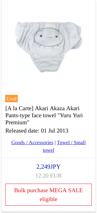 >>26437 Обязательно! >Какой-то закрытый торрент-трекер? https://interviewfor.red/en/index.html Хороший, но без теребайтов дискового пространства и белого ip держать ratio невозможно. Девочка себе ~70гигов на сервер, и там всего 10 гигов за год накапало. >Посмотреть что ли? Хорошее. >Но я про то, что на лоте "Used"-шильдик. И примечание про "face towel". Вот и думай, кто и как их использовал. Машина перевод десу. Face, видимо, потому что на голову, towel потому что не трусы(настоящие девочковые трусы не портянки, там технология производства). Used трусы покупать не стала. каптчя булочны